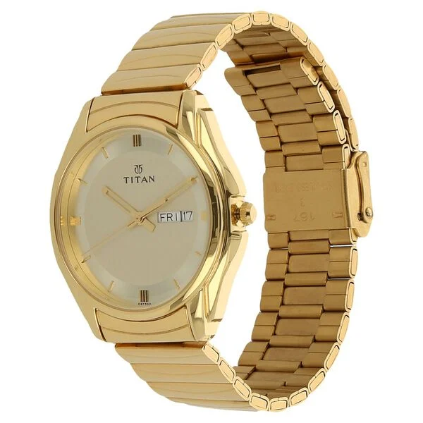 Make a statement with this men’s analog watch showcasing a round champagne dial adorned with three plain hands, slanted markings at five-minute intervals, and a day and date display at the 3rd hour. The gold case, crowned for easy time adjustment, adds a touch of sophistication. The stainless steel gold strap, secured with a special three-piece sliding clasp, completes the ensemble, making it a versatile accessory. With a 24-month warranty, this watch seamlessly combines functionality with timeless style.