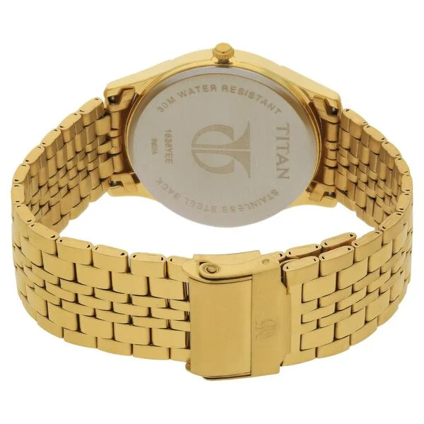 Embrace sophistication with this analog watch for men featuring a silver round dial within a metal case. The dial boasts three plain hands, day, and date displays. The gold metal strap, secured with a sliding clasp, adds a touch of elegance. This timeless piece is a perfect blend of style and functionality.