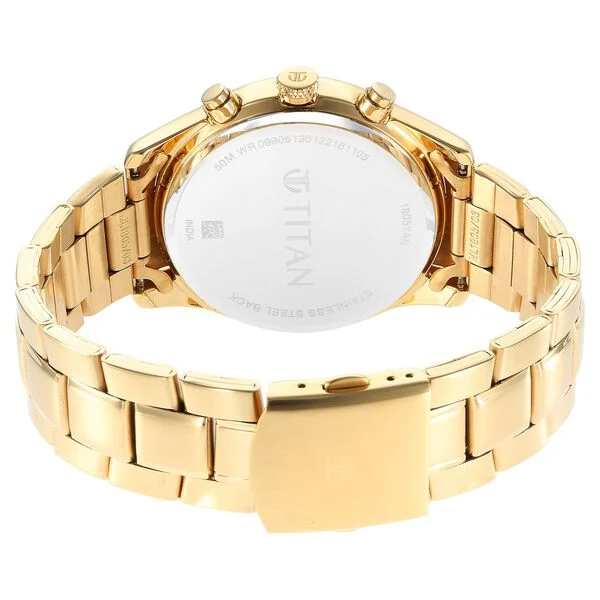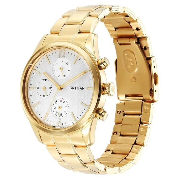 Flaunt a stylish look with this gold stainless steel strap analog watch from the Classique collection by Titan for men. It comes with a bracelet band style and a push-button clasp that is sure to look stylish on your wrists. It has a multifunction feature along with European numbers and stick dial type. This watch is equipped with a sword needle and a silver round dial shape of 42 mm diameter, which adds to its utility. The quartz movement and analog display accentuate its features. Moreover, it is water-resistant up to 50 m and has a day and date calendar type, making it a must-have.