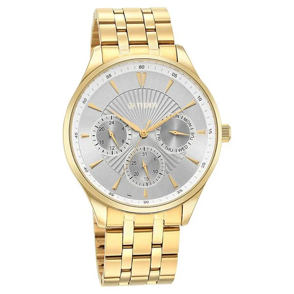 Give your timepiece collection a completion with this men’s analog watch from the Opulent III collection by Titan. Functional on a quartz movement, the silver round dial is housed in a 42 mm case. It displays plain three hands and a crown for time adjustment. The stainless steel bracelet flaunts a golden hue that accentuates the look of the watch. Besides, it is completed with a push-button clasp to ensure a secure fit on the wrist.