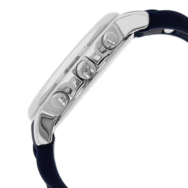 Make a distinct style statement wearing this women’s analog watch from Tommy Hilfiger. Enclosed in a 39 mm case, the silver round dial is secured by a mineral glass. It displays plain three hands, bold stick indices at five-minute intervals, three subdials, two pushers, stone studded detailing and a crown for time adjustment. The silicon strap vaunts a navy hue that enhances the look of the watch.