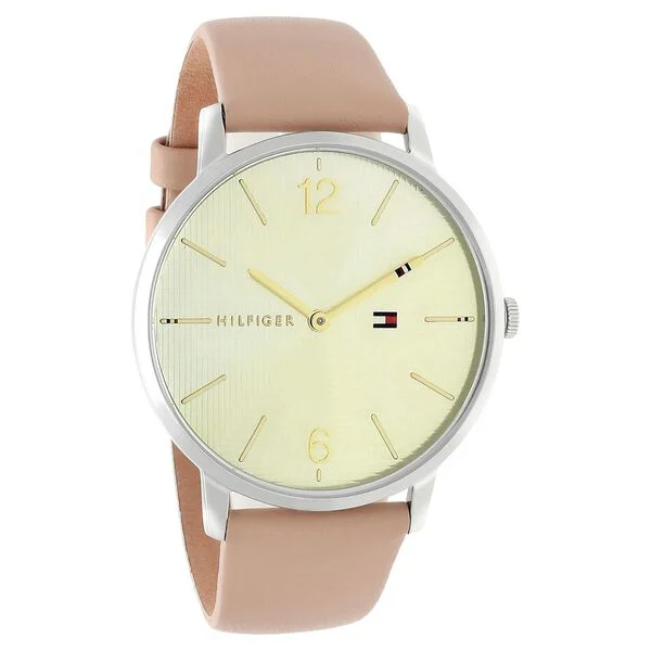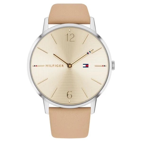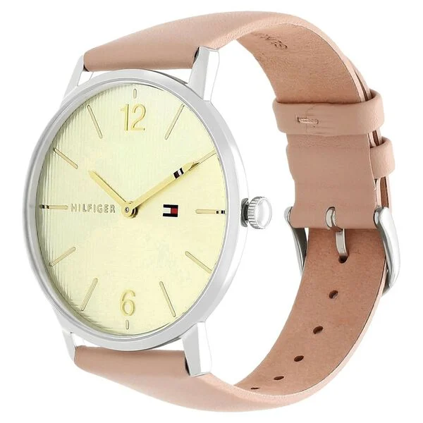 If you are craving for a distinct look then this women’s analog watch from Tommy Hilfiger is a must-have. The golden round dial displays plain two hands, numeral markings at the 6th and 12th-hour position, long stick markings at five-minute intervals and a crown for time adjustment. The genuine leather strap comes in a beige hue that further elevates the look of the watch.